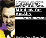 Seattle, WA. Would you like to worry less? Sure, we all would! That's why noted psychology expert and "Generation X" slacker, Eddie Cantrell, has developed the revolutionary self-help book entitled "A Pragmatic Analization of the Human Psyche and Deficiency of Interaction: Mindset for Apathy." Consisting of twelve heavily detailed and involved steps, the program guarantees participants to be one hundred percent worry-free if all the instructions are correctly and painstakingly followed. In the forward, Switzerland president, Adolf Ogi writes, "Imagine, you too could be without a care in the world, simply because you're not willing to exert the effort. If ignorance is bliss, then sign me up!" The book can be ordered by mail order. "Mindset for Apathy" isn't available in stores. Sorry no CODs.