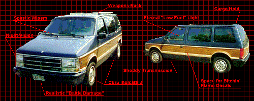 Description: While the MegaVan looks unassuming and is sometimes even poorly referred to "a family van," the truth is that it's a several ton machine thriving on chaos and destruction. Greatly feared by those who know its powers, the MegaVan has claimed many a victim and has spilled much blood of the foolish mortals. It feels no remorse and has a soul as dark as the navy steel that encases it. The ominious force that the MegaVan wields will soon be increased tenfold by some bitchin' flame decals.